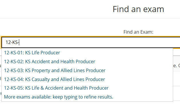 Start typing "12-KS-" to create a list of available exams. Select the exam necessary for the license you're seeking. Note: Use the OP prefixed exams for Online Proctored, otherwise select the exam without the OP prefix for in-person exams